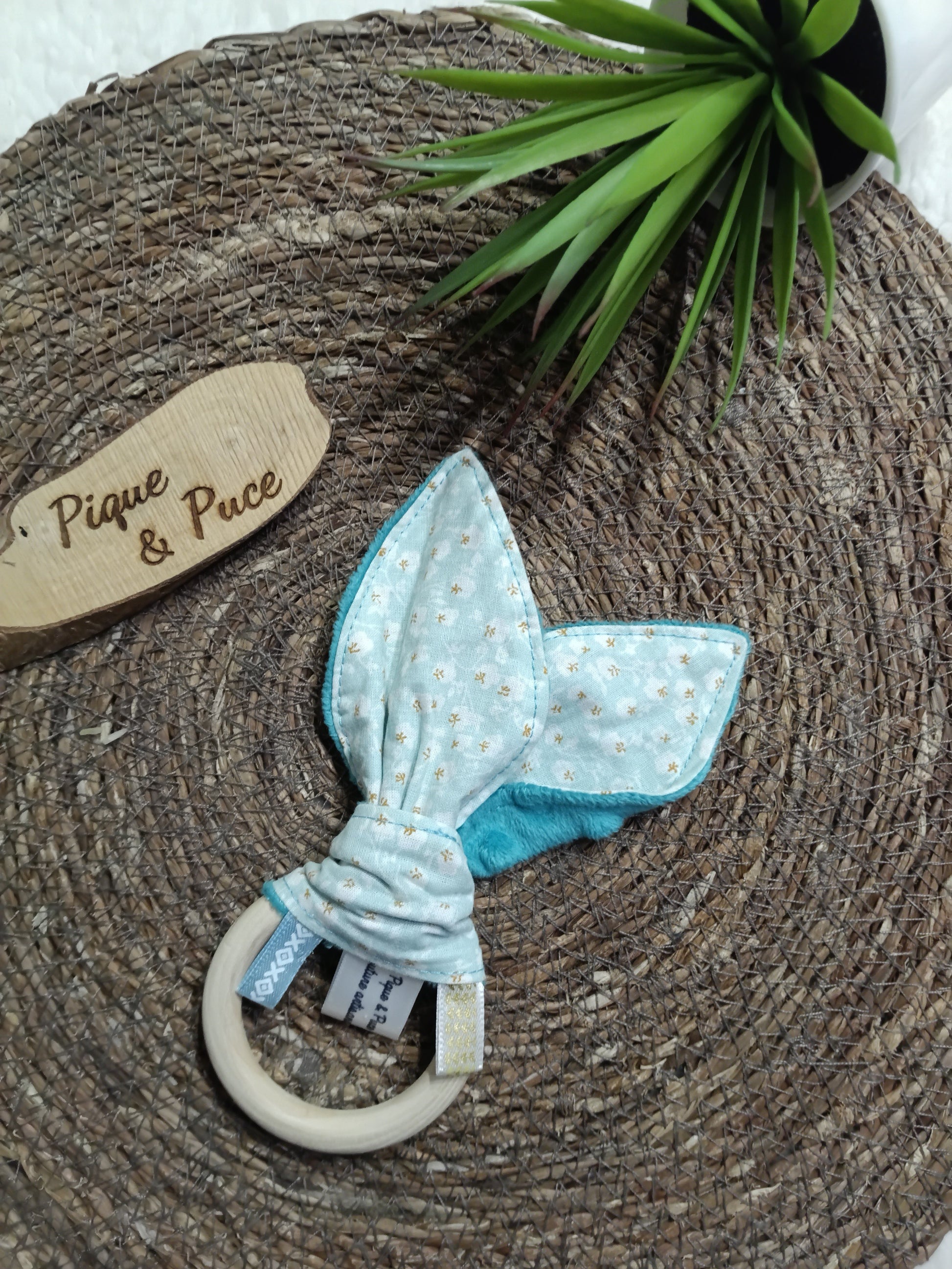Une partie en tissu en forme d’oreilles de lapin, composée de coton imprimé et de minky ultra-doux pour un effet réconfortant.